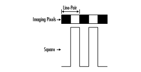 为了说明这一概念,想象两个方块成像在CCD相机的像素。假设的主要放大透镜,一平方填充一个摄像头像素(图2),如果没有填充像素之间的空间,它会显示一个大的红色的长方形。但是,如果“白色空间”,或空间独特的不同于原来的像素的颜色,发现之间的像素,相机可以区分两个正方形(图2 b)。因此,红场的配对和“白色空间”成为lp /毫米,这对应于两个单独的像素。