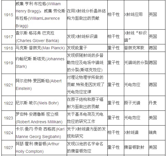 光学是一门古老而又年轻的学科,当然在1901年之前,人类就已经在光学研究上取得了巨大成就。从1901年第一次颁奖以来,到2012年已经颁发108次,期间1916年、1931年和1940-1942年没有颁发。纵观诺贝尔物理学奖的百年颁奖历史,与光学直接或者间接相关的获奖成果有45项,占整个物理学奖的大约40%。100 多年来,光学的研究大多与光的相干性、量子性和非线性这三个范畴有关. 纵观与光学相关的诺贝尔物理学奖可以发现:95%以上的获奖工作集中在光的相干性和量子性(其中,有关光的量子性的研究近70 %) 。表1 列出了诺贝尔物理学奖中与光学直接或间接相关的获奖工作、获奖者姓名、获奖年份及所属范畴以及具体领域。奖项中涉及理论、实验方法、技术、仪器、器件、材料以及科学发现等诸多方面的重大成果。