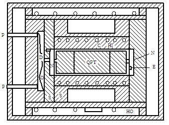 图6.14为这种石英谐振式压力传感器的结构。图中QPT靠薄弹簧片N悬浮于传压介质油O中。压力容器由铜套筒C和钢套筒S构成,隔膜D与钢套筒S连接,E为QPT的电接头。QPT的温度由内加热器HI和外加热器HO控制。当传感器工作时,可使QPT保持在±0.05°C恒温以内,从而使振子达到零温度系数。隔膜D是容器内的油和外压力介质的分界层。液体油O(合成磷酸盐脂溶液)热膨胀系数比较低,以便减小因温度变化引起的液体油压变化而造成的(温度)读数误差。端盖用不锈钢制造,P为压力进口