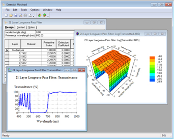Essential Macleod 是一套完备的光学薄膜分析与设计的软件包,可以在所有 64/位32 位的Microsoft Windows操作系统下运行,并且具有真正的多文档操作界面;它能满足光学镀膜设计中的各种要求,从简单的单层膜到严格的分光膜;也能对波分复用(WDM)和密集波分复用(DWDM)滤波片进行测评;可以从头开始设计也可以优化已有的设计;可以勘测在设计中的误差,也可以萃取设计用到的光学薄膜常数。